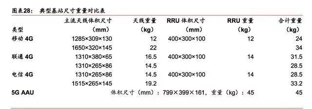 根据图表30,4G时代,无源天线+RRU重量大概在24-34kg,目前测试中的5GAAU重量大概在45kg左右,重量同比增加了32%~88%。