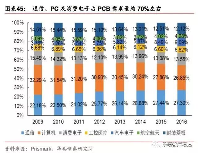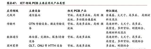 通信领域PCB板主要集中在无线、传输、数据通信等应用领域,产品涵盖了背板、高速多层板、高频微波板等。不同于消费电子类PCB产品多为挠性板(FPC)和高密度互联印刷电路板(HDI),通信用PCB多为刚性多层板。