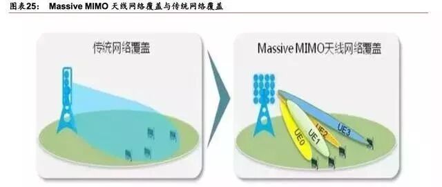 采用MassiveMIMO的5G大规模天线不仅仅是数量的增加,天线的形式也将由无源转向有源,可实现各个天线振子相位和功率的自适应调整,显著提高MIMO系统的空间分辨率,提高频谱效率,从而提升网络容量。
