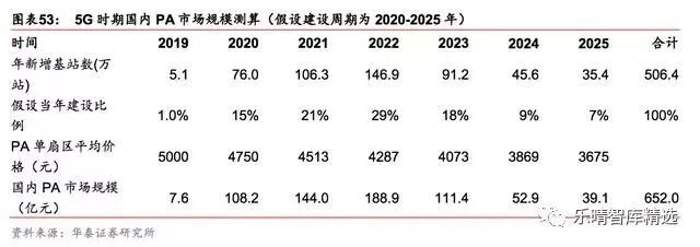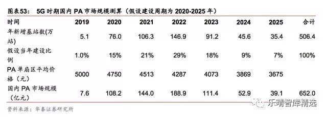 在4G建设高峰期,国内市场平均每年功率放大器的市场空间约在42亿元。考虑到单站功率放大器价格的大幅提升,到了5G时代,单站价格的大幅上涨将推动功率放大器的总市场空间大幅提升,假设5G建设周期为2020-2025年,预计建设高峰期(2020-2023)宏基站功率放大器市场空间每年可达约108.2-188.9亿元,相较4G规模建设期,市场空间同比增长158%-350%。