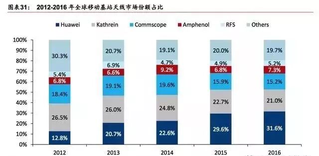 其中2016年各大厂商占比分比是华为31.6%、凯瑟琳21.0%、康普15.2%、安费诺7.3%、RFS5.2%,华为市场占有率比2013年有10.9pct的提升。
