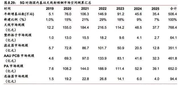 如上文所述,我们预计国内5G宏基站规模可达506.4万站,考虑到近几年PCB价格稳定且略有上涨,假设PCB价格不变,对应5G时期射频侧PCB规模可达461.8亿元。