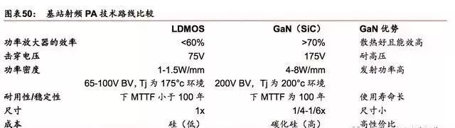 随着半导体材料工艺的进步,氮化镓(GaN)正成为中高频频段PA主要技术路线,GaN技术优势包括能源效率提高、带宽更宽、功率密度更大、体积更小,使之成为LDMOS的天然继承者。