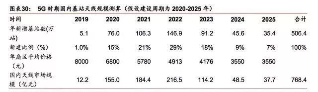 5G天线市场空间同比增长124%~324%。假设5G建设周期为2020-2025年,预计建设高峰期(2020-2023年)宏基站天线市场每年空间可达114.2-184.4亿元;相较4G建设高峰期国内平均每年约50多亿元(高峰期4G基站一年建设数为100万站,单幅天线平均价格1700元)的宏基站天线市场,5G市场空间同比增长124%~324%。